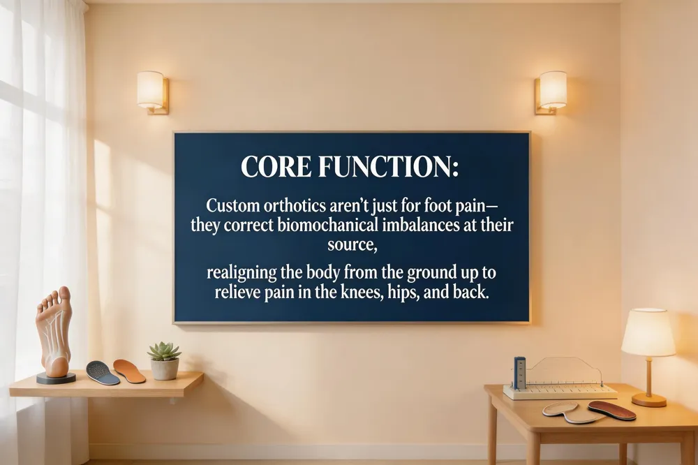 - Custom orthotics function as biomechanical correctors for the entire kinetic chain, addressing root causes of pain in the knees, hips, and back by realigning the body from the ground up.