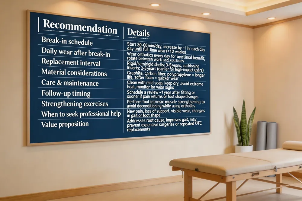 Patient education is essential: keep the orthotics clean, avoid extreme temperatures, monitor for wear, and schedule a follow‑up visit about a year after fitting or sooner if pain returns.