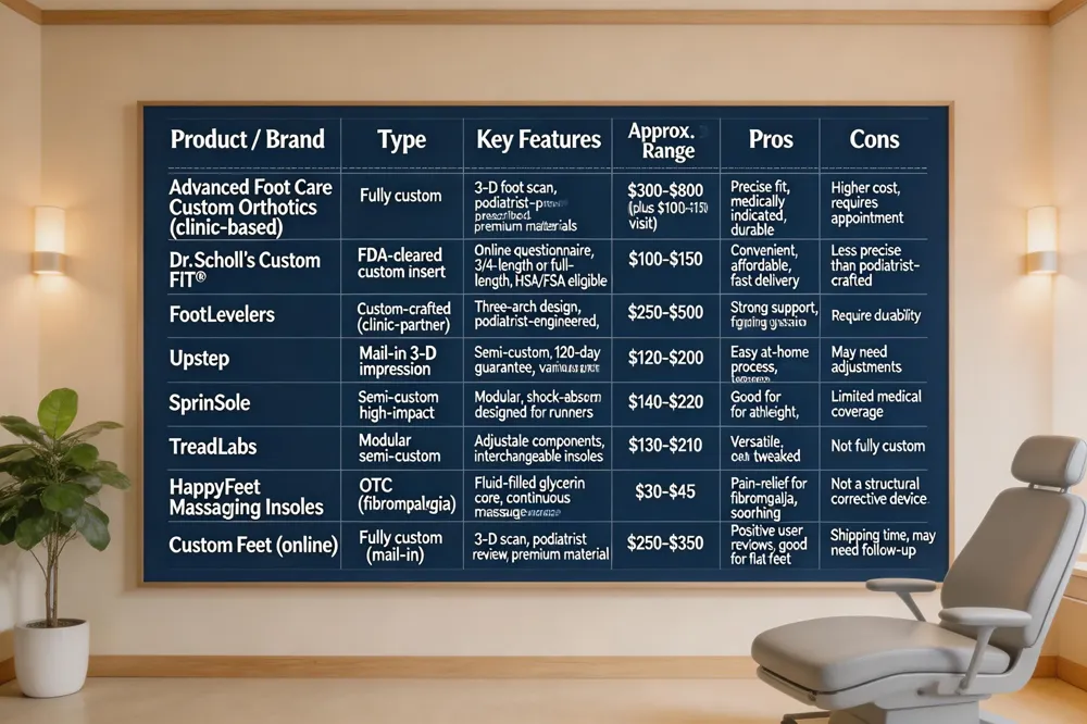 Dr. Scholl's custom insoles Dr. Scholl’s Custom FiT® orthotics are FDA‑cleared inserts created after an online foot‑shape questionnaire. They provide 3/4‑length or full‑length support for plantar fasciitis, heel pain, and flat feet, and are HSA/FSA eligible. While convenient and affordable, they lack the precise prescription‑based tailoring that a podiatrist‑crafted orthotic provides for complex biomechanical issues.