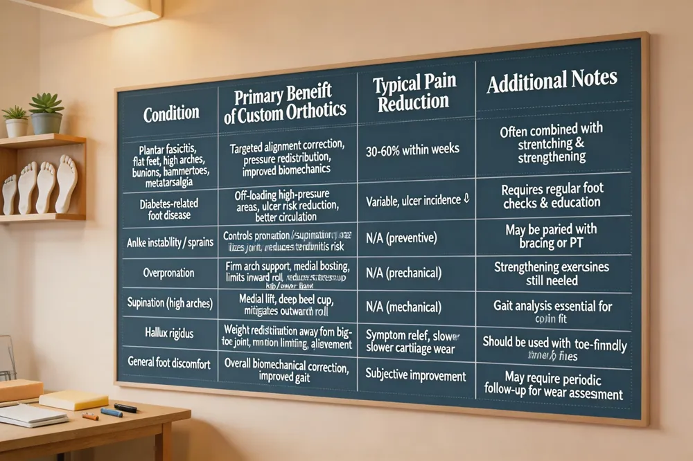 Custom orthotics provide targeted pain relief by correcting foot alignment, evenly distributing pressure, and improving overall biomechanics. Patients with plantar fasciitis, flat feet, high arches, bunions, hammertoes, and metatarsalgia often report a 30‑60% reduction in pain within weeks of use.