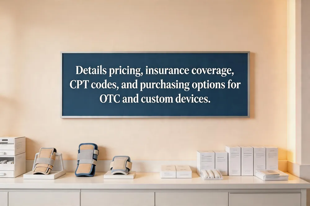 Cost for plantar fasciitis – Custom devices $300‑$800; semi‑custom $60‑$300; OTC $10‑$20.