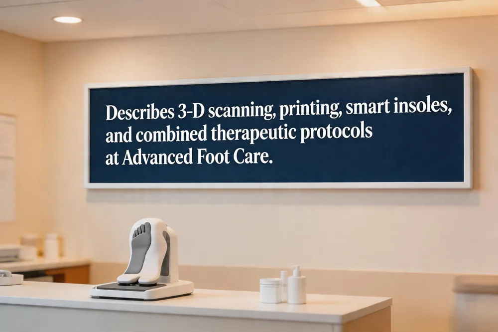 Modern podiatry blends precise orthotic fabrication with cutting‑edge technology. At Advanced Foot Care we start with 3‑D foot scans and pressure‑mapping to create a digital model, then 3‑D print durable, semi‑rigid orthotics that match each arch, heel cup, and metatarsal contour. Smart insoles collect gait data, letting clinicians fine‑tune support remotely. For patients with chronic plantar fasciitis, flat feet, or post‑surgical rehab, minimally invasive procedures—such as ultrasound‑guided tenotomy or percutaneous bunion correction—are paired with custom inserts to accelerate healing. Regular follow‑up ensures wear‑adjusted pressure redistribution, maintaining alignment of the knees, hips, and spine for long‑term health.