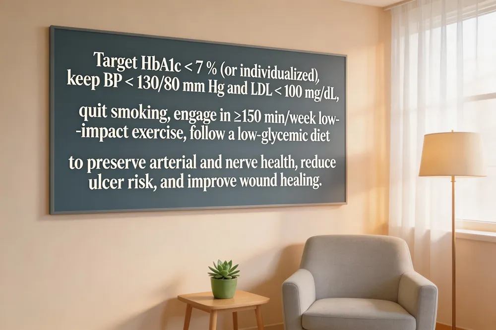 Blood pressure, cholesterol & smoking – Keep BP < 130/80 mm Hg and LDL < 100 mg/dL; statins and antihypertensives are often needed. Smoking cessation restores peripheral flow and cuts infection risk.