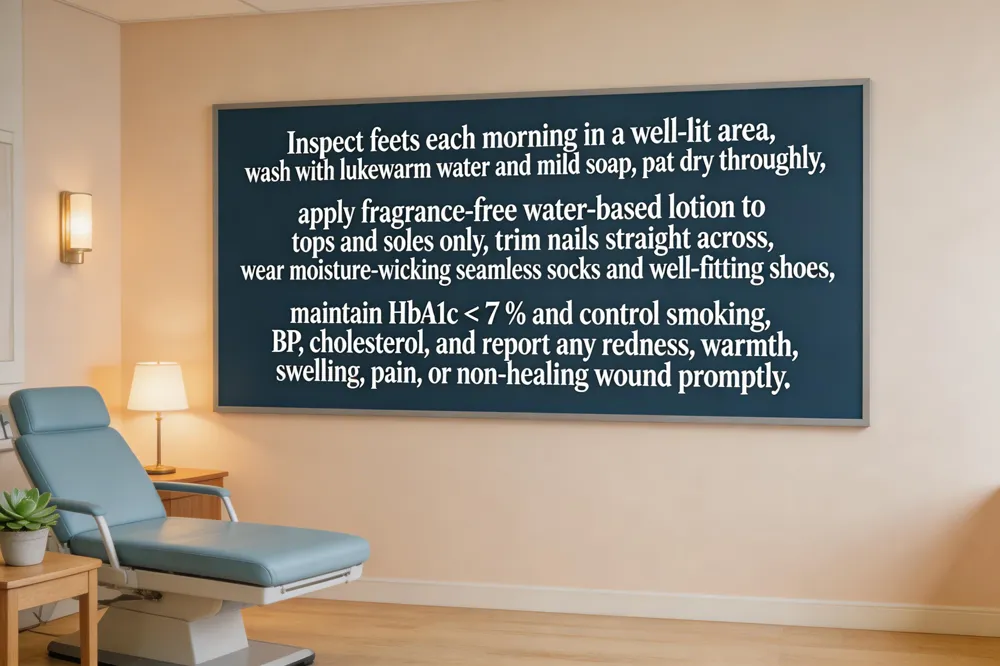 Daily inspection: each morning use a well‑lit area, mirror if needed, check tops, soles, between toes for cuts, blisters, redness, swelling, calluses, nail changes.