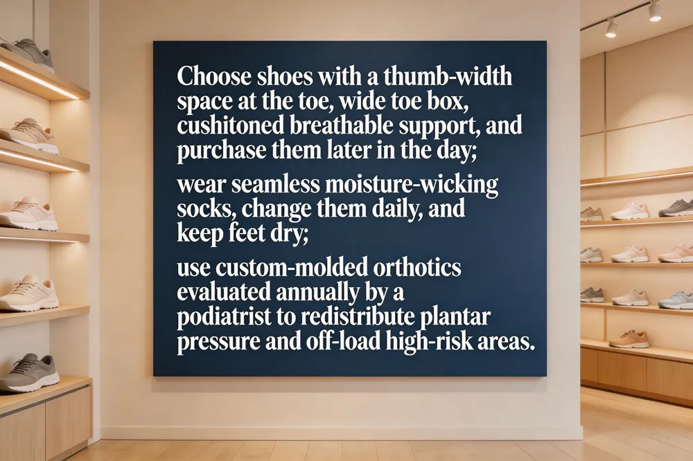 Diabetic patients should wear shoes that leave a thumb‑width (≈½ inch) of space between the toe tip and the shoe, have a wide toe box, and provide cushioned, breathable support. Shoes should be purchased later in the day when feet are at their largest and broken‑in gradually. Moisture‑Wicking and Seamless Socks