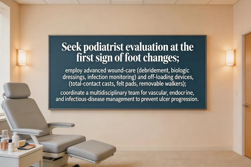 Prompt podiatrist evaluation is the cornerstone of diabetic foot ulcer prevention. Patients should inspect both feet daily for cuts, blisters, calluses, redness, swelling, or nail changes and report any abnormality immediately. A podiatrist can perform a thorough vascular and neuropathy assessment, often using monofilament testing and PADNet technology, and initiate off‑loading.