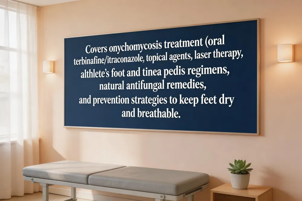 Oral antifungals such as terbinafine 250 mg daily for 12‑16 weeks (or itraconazole) provide the highest cure rates for onychomycosis. Topical agents (efinaconazole, tavaborole, ciclopirox nail lacquer) are useful adjuncts or when oral therapy is contraindicated but require months of daily application and are less effective alone. In‑office laser or photodynamic therapy can reduce fungal load, and surgical nail removal with debridement allows direct topical treatment of severely damaged nails. Maintaining dry feet, breathable footwear, and addressing any concurrent athlete’s foot support long‑term success.