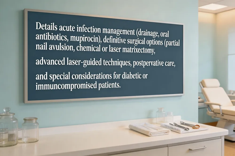 Advanced techniques such as laser‑guided matrixectomy or radiofrequency ablation achieve similar success with even faster recovery, allowing patients to resume normal footwear within a week. Post‑procedure care includes elevation, warm compresses, and open‑toed shoes to reduce pressure. Follow‑up within 1–2 weeks confirms infection resolution and proper healing.