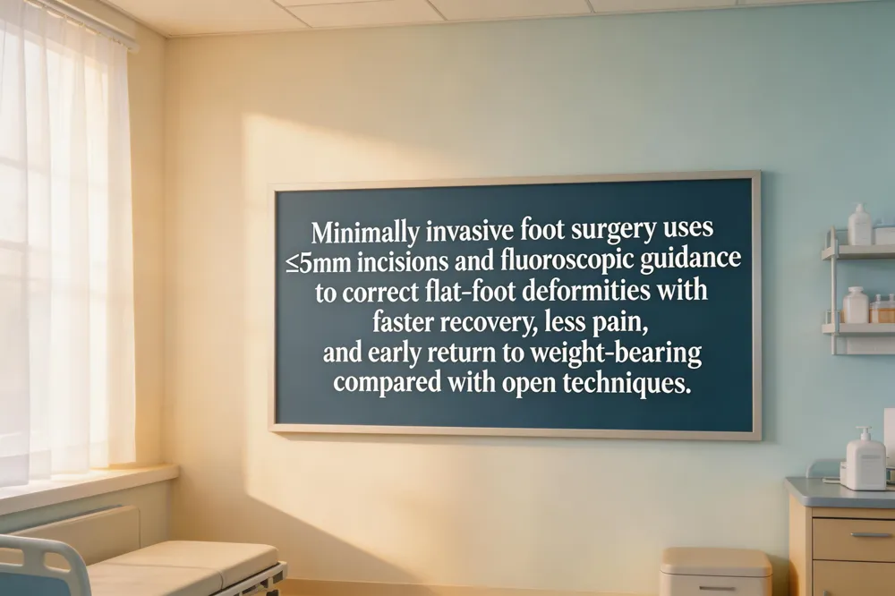 Flat‑feet surgery MIS for flat feet restores a functional arch by correcting bone, tendon, and ligament pathology. Common percutaneous procedures include a medializing calcaneal osteotomy (heel‑slide) and tendon transfers such as flexor digitorum longus augmentation of the posterior tibial tendon. For flexible flatfoot, subtalar extra‑articular screw arthroereisis or percutaneous osteotomies achieve alignment with minimal tissue disruption.