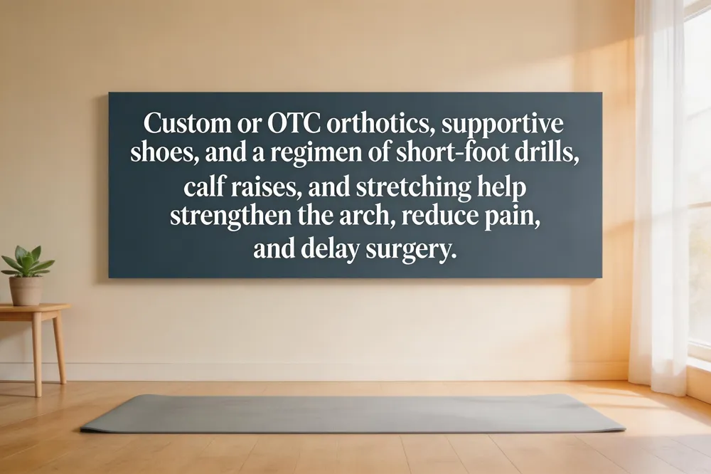 A podiatrist will perform this assessment and prescribe custom orthotics, and teach stretching (Achilles, calf) and strengthening (short‑foot, tibialis posterior) exercises. For children, supportive shoes, activity modification, and orthotics are usually sufficient; surgery is rarely needed. Adults start with conservative care—arch‑support shoes, NSAIDs, physical therapy, and weight management—and progress to minimally invasive procedures (percutaneous osteotomies, tendon transfers, ligament augmentation) if pain persists or deformity advances.