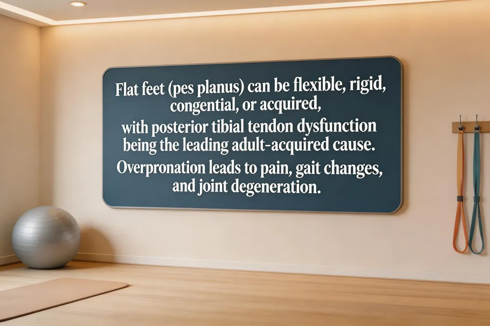 Flat feet (pes planus) describe a foot with little‑to‑no medial arch when weight‑bearing. They can be flexible (arch appears off‑weight‑bearing), rigid (no arch in any position), congenital (present at birth, often genetic or related to connective‑tissue disorders such as Ehlers‑Danlos), or acquired (develop later due to structural wear).
