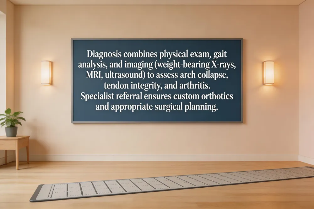 Flat feet (pes planus) are first evaluated with a thorough physical exam and gait analysis. The clinician observes the foot from the front, side, and back, checks arch height while standing and non‑weight‑bearing, and looks for the “too many toes” sign, heel valgus, or abnormal shoe wear. Imaging—weight‑bearing X‑rays, MRI, or ultrasound helps identify tendon degeneration (especially posterior tibial tendon), spring‑ligament tears, or arthritis and guides treatment planning.