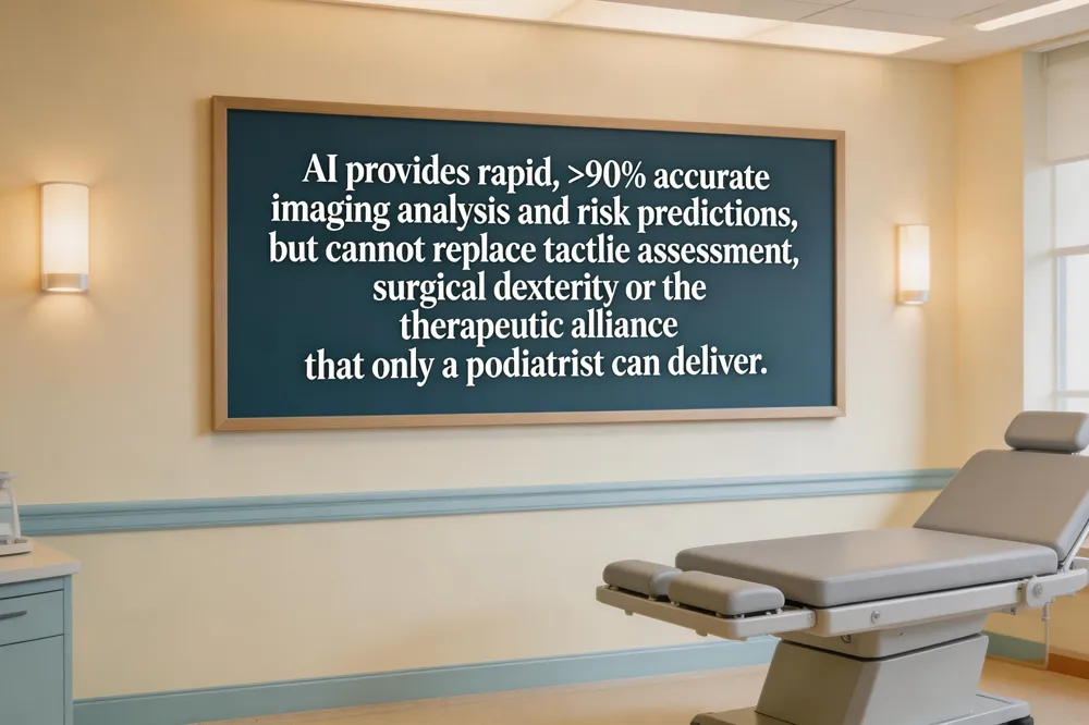 Artificial intelligence is rapidly becoming a powerful clinical decision‑support tool in podiatry, but it is not a substitute for the podiatrist. AI‑based imaging analysis can flag fractures, early osteoarthritis, and diabetic foot ulcers with >90 % accuracy, and predictive models can forecast ulcer risk or postoperative complications (2025‑2026 studies). These capabilities streamline diagnosis, reduce time to treatment, and free clinicians to focus on higher‑order tasks. However, AI cannot replicate the hands‑on manual dexterity required for minimally invasive foot surgeries, nor can it assess tactile cues such as wound depth, temperature, or subtle tissue texture. Equally important, the therapeutic alliance—listening to patient concerns, providing reassurance, and customizing education—remains a uniquely human interaction that AI chatbots and voice‑to‑text tools can augment but not replace. Consequently, AI will continue to act as an adjunct, enhancing efficiency and precision while preserving the podiatrist’s essential role in hands‑on care and patient rapport.