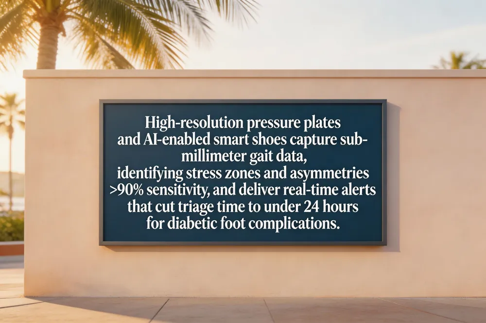 Pressure‑sensor gait analysis and by combining high‑resolution pressure plates with computer‑vision algorithms, can capture sub‑millimeter biomechanical data that the naked eye misses. Machine‑learning models turn these raw pressure maps into actionable insights—identifying high‑stress zones, asymmetries, and early‑stage flat‑foot or hallux‑valgus patterns with >90 % sensitivity in peer‑reviewed studies. Smart shoes equipped with embedded pressure sensors and AI analytics extend this capability into daily life; the devices stream real‑time gait metrics to a cloud platform where convolutional networks flag abnormal loading and suggest corrective exercises. Predictive risk models integrate the gait data with electronic health‑record history, imaging findings, and wearable temperature sensors to calculate a personalized probability of diabetic foot ulceration or stress‑fracture development. In U.S. clinics such as those in Northwestern Chicago and South Florida, these AI‑driven tools have reduced the time from symptom onset to specialist triage from days to under 24 hours, enabling early preventive interventions and paving the way for data‑driven, minimally invasive foot care.