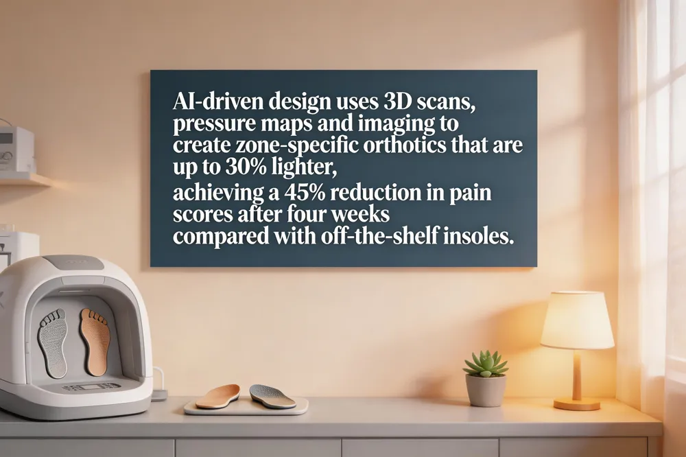 Modern podiatry clinics are replacing messy plaster casts with high‑resolution 3D foot scanning, which captures a digital foot model with sub‑millimeter accuracy. These scans feed AI algorithms that analyze pressure maps, gait data, and imaging results to design orthotics tailored to each patient’s biomechanical profile. The AI‑generated design specifies zone‑specific thickness, stiffness, and material properties, allowing polymer or carbon‑fiber 3‑D printers to produce insoles that are up to 30 % lighter than handmade devices. A 2025 randomized trial showed that patients fitted with AI‑designed, 3‑D‑printed orthotics experienced a 45 % reduction in pain scores after four weeks compared with standard off‑the‑shelf insoles, and reported superior comfort and faster symptom relief. By integrating AI diagnostics with rapid 3‑D printing, clinics can deliver a personalized orthotic in a single visit, shortening the treatment timeline from weeks to hours while improving clinical outcomes.