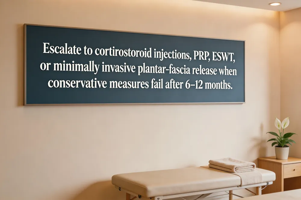 Modern podiatry treats plantar fasciitis with a tiered approach that moves from evidence‑based conservative care to minimally invasive procedures when needed. Custom orthotics—whether prefabricated or custom‑molded—provide arch support and redistribute heel pressure, while night splints keep the ankle dorsiflexed overnight, gently stretching the plantar fascia and Achilles tendon to lessen heel pain. If inflammation persists, targeted corticosteroid injections can offer rapid, short‑term relief, whereas platelet‑rich plasma (PRP) delivers growth factors that promote tissue healing over several weeks. Extracorporeal shock‑wave therapy (ESWT) uses focused acoustic waves to stimulate collagen remodeling and is effective for chronic cases that fail traditional measures. For the small subset of patients with refractory pain after 6–12 months of diligent stretching, orthotic use, and night‑splint therapy, minimally invasive plantar‑fascia release or percutaneous tenotomy performed by an experienced foot‑and‑ankle surgeon can restore function with a small incision and local anesthesia. Patients should seek specialist evaluation promptly when heel pain is sharp, worsening, or accompanied by swelling, stiffness, or inability to bear weight—signs that may require imaging, injections, or surgical consultation. Early intervention, combined with activity modification, low‑impact cross‑training (e.g., swimming), and weight management, typically resolves symptoms within three to six months, reserving surgery for the rare chronic case.