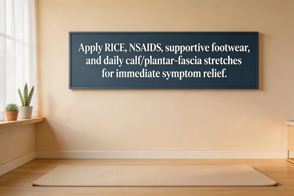 How to cure heel pain fast at home: Ice, elevate, NSAIDs, calf and fascia stretches, eccentric heel raises, supportive shoes, and night splint or towel roll.