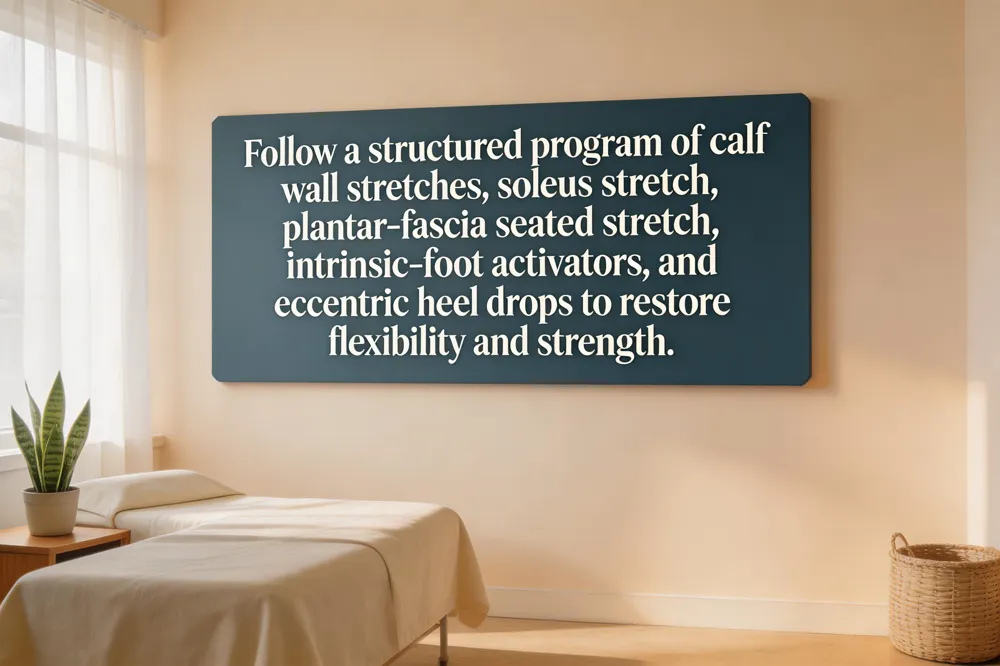A comprehensive home program for plantar fasciitis should address calf tightness, plantar‑fascia flexibility, and intrinsic foot strength. Calf (gastrocnemius) wall stretch – stand facing a wall, place the affected foot back with a straight knee, keep the heel grounded, and lean forward 30‑45 seconds; repeat 2‑3 times. Soleus stretch – same stance but bend the back knee slightly to target the deeper calf muscle, holding for the same duration. Plantar‑fascia seated stretch – sit, cross the ankle of the painful foot over the opposite knee, pull the toes toward the shin while massaging the arch, and hold 30‑45 seconds, 2‑3 times daily. Intrinsic‑foot activators – towel curls (toe scrunches) and marble pickups (10‑15 reps, 1‑2 sets) strengthen the arch, while the ankle‑alphabet drill improves ankle mobility. Eccentric heel drops and raises – stand on a step, raise both heels, then lower each heel slowly below the edge (10‑15 reps, 2‑3 sets) and perform calf raises for additional strength. These five core routines, performed 2‑3 times per day, provide the “plantar fasciitis stretches” and “exercises” needed to reduce morning pain, improve flexibility, and support the foot during daily activities. Consistent use of night splints , supportive footwear , and low‑impact cross‑training (e.g., swimming) enhances recovery and minimizes recurrence.