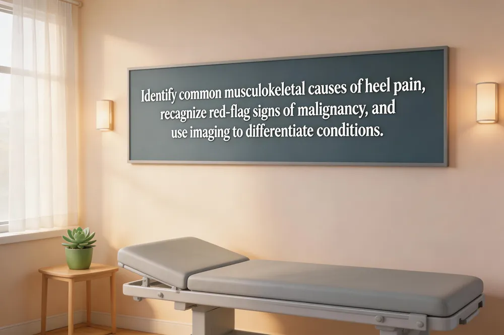 Heel pain is almost always caused by musculoskeletal conditions such as plantar fasciitis, Achilles tendinitis, heel spurs, stress fractures, or nerve irritation. Cancer involving the heel is exceedingly rare, typically metastatic to the calcaneus, and should be suspected only when pain persists despite orthotics and is accompanied by systemic signs (weight loss, fatigue). Imaging (X‑ray, MRI, bone scan) and possibly biopsy confirm malignancy.