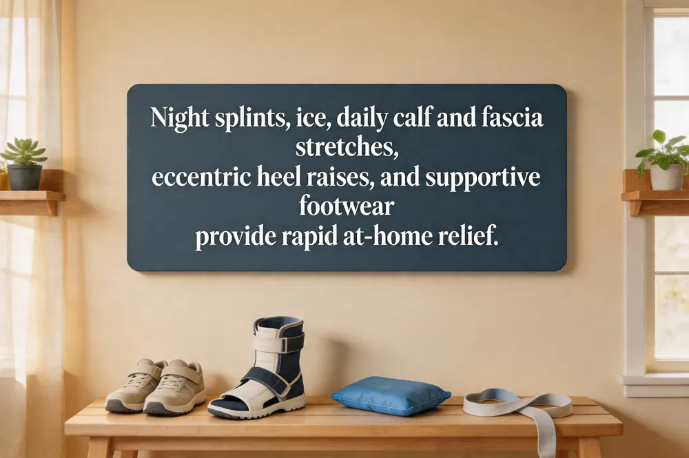 How to cure heel pain fast at home? Use a night splint, apply ice, stretch the calf and fascia, perform eccentric heel raises, wear supportive shoes or orthotics, and avoid high‑impact activities until symptoms improve.