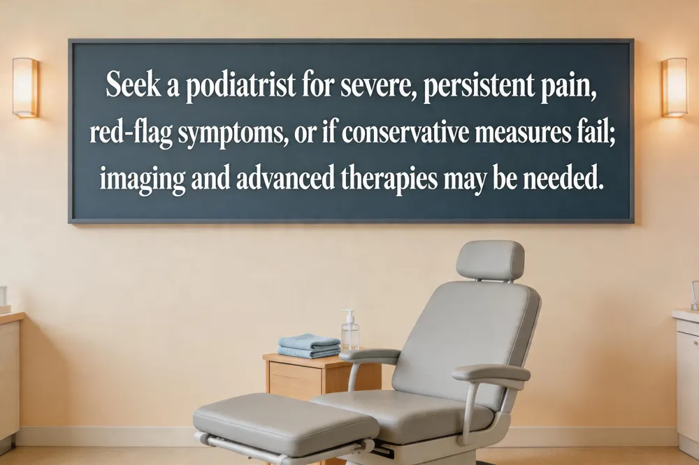 Red‑flag symptoms such as sudden, severe heel pain that does not improve with ice, rest, or NSAIDs; swelling, bruising, numbness, or a visible deformity should prompt an immediate podiatrist evaluation. A thorough history and physical exam, sometimes supplemented by X‑ray, ultrasound or MRI, help rule out stress fractures, tarsal tunnel syndrome, or tumors. When conservative measures fail, advanced non‑surgical options—custom orthotics, night splints, physical‑therapy‑guided stretching, platelet‑rich plasma, or extracorporeal shock‑wave therapy—can accelerate healing. For truly refractory cases, minimally invasive surgery such as endoscopic plantar‑fascia release or ultrasonic tissue repair offers relief with a short recovery.