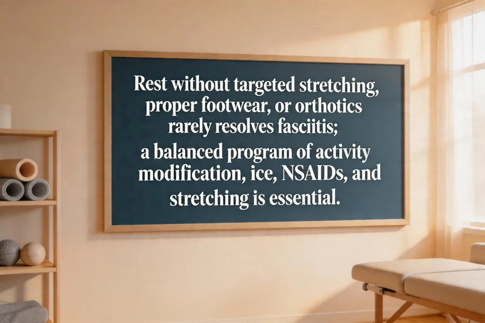 When these measures are applied consistently, most patients experience meaningful relief within weeks to months. Persistent pain warrants evaluation by a podiatrist for custom orthotics, physical‑therapy guided strengthening, or targeted injections. Rest alone, without structured stretching, supportive footwear, and activity modification, rarely resolves plantar fasciitis.