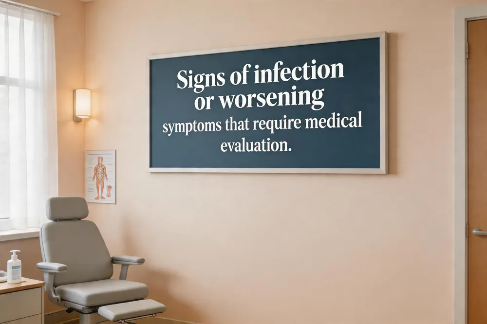 Signs of infection such as increasing redness, swelling, warmth, pus, or fever indicate that home care is insufficient. High‑risk groups—including people with diabetes, peripheral vascular disease—should seek evaluation promptly, because delayed treatment can lead to cellulitis, osteomyelitis, or sepsis.