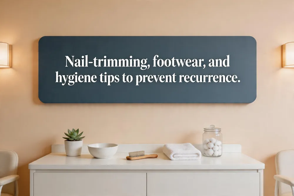 Quick relief starts with warm, soapy water soaks (10‑20 min, 3‑4 times/day) to soften skin, followed by gently lifting the nail edge with a fresh cotton wick or waxed dental floss and applying petroleum jelly or an OTC antibiotic ointment. Use acetaminophen or ibuprofen for pain. Seek professional care promptly if pain, swelling, redness, warmth, pus, or fever develop, or if you have diabetes, peripheral vascular disease, or neuropathy—conditions that mask infection and impair healing. For long‑term prevention, trim toenails straight across leaving a small white margin, wear roomy low‑heeled or wide‑toe‑box shoes, keep feet clean and dry, and consider periodic podiatrist check‑ups to catch early changes before they become severe.