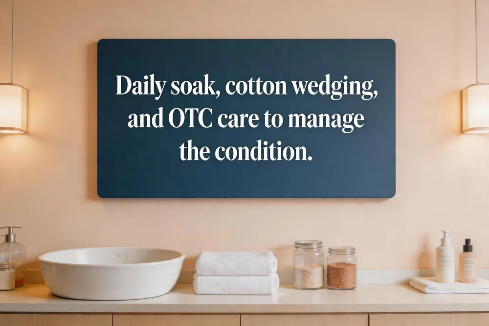 If pus is present, a sterile needle can be used to gently express it after soaking, followed by antibiotic ointment and dressing. Patients should wear roomy, open‑toed shoes and avoid tight footwear for one to two weeks. Prompt referral is essential for diabetic or vascular patients, as delayed treatment can lead to cellulitis or osteomyelitis.