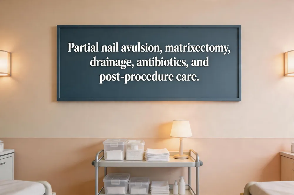 If pus is present, the podiatrist drains the infection under local anesthesia, cleans the wound, and may prescribe oral antibiotics. A sterile dressing, foot elevation, and avoidance of tight shoes support healing.