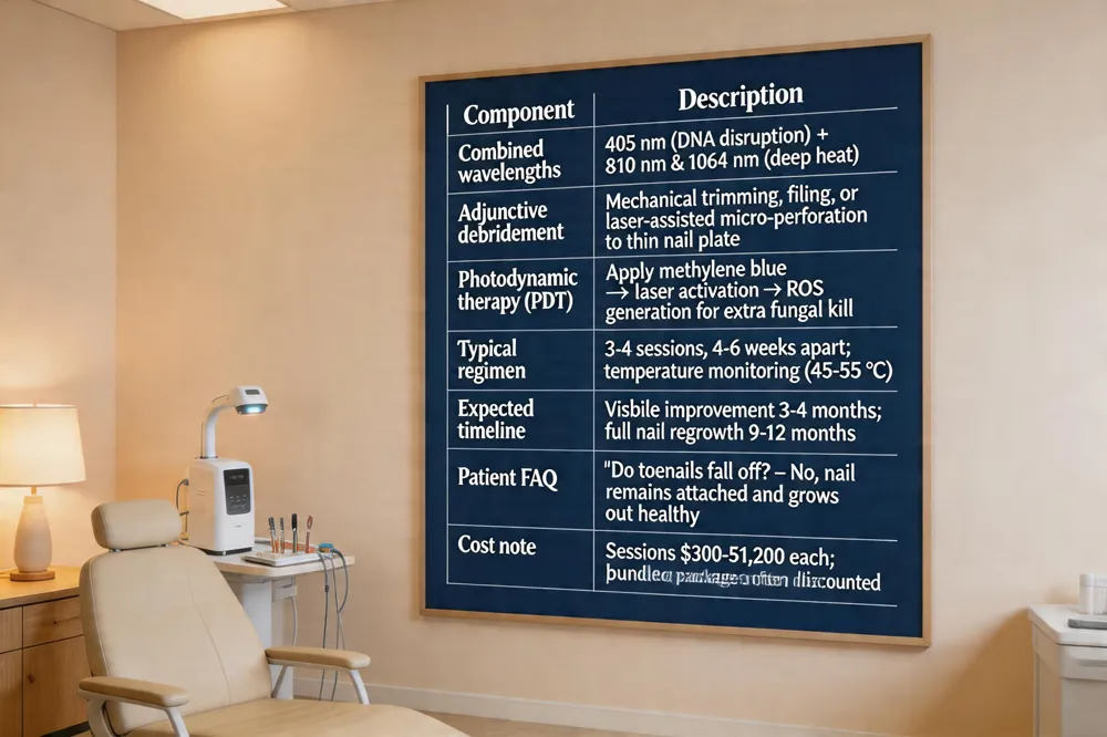 Adjunctive techniques enhance these effects. Mechanical debridement (trimming, filing, or laser‑assisted micro‑perforation) thins the nail plate, improving light transmission. Photodynamic therapy (PDT) adds a photosensitizing agent such as methylene blue; after a brief soak, the laser activates the agent, generating reactive oxygen species that further kill fungi.