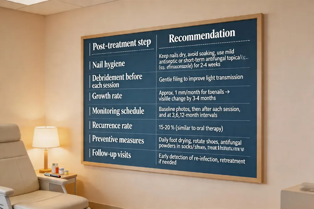 After laser sessions the most important step is meticulous nail hygiene. Patients should keep the treated nail dry, avoid soaking, and use a mild antiseptic or antifungal topical (e.g., efinaconazole or ciclopirox) for 2–4 weeks to suppress any residual organisms. Gentle filing or debridement before each session improves light penetration, and continued topical therapy after the laser helps maintain a clear nail bed. Nail regrowth follows the natural growth rate—approximately 1 mm per month for toenails—so visible improvement appears within 3–4 months and full replacement can take 9–12 months. Clinicians recommend photographic documentation at baseline, after each session, and at 3‑, 6‑, and 12‑month intervals to objectively track clearance and patient satisfaction. Recurrence is reported in 15‑20 % of cases, comparable to oral therapy, and is usually linked to persistent moisture, untreated athlete’s foot, or contaminated footwear. Preventive measures include daily foot drying, rotating shoes, using antifungal powders in socks and shoes, and treating any concurrent skin fungal infection promptly. Regular follow‑up visits allow early detection of re‑infection and timely retreatment, ensuring long‑term success while minimizing the need for systemic medications.