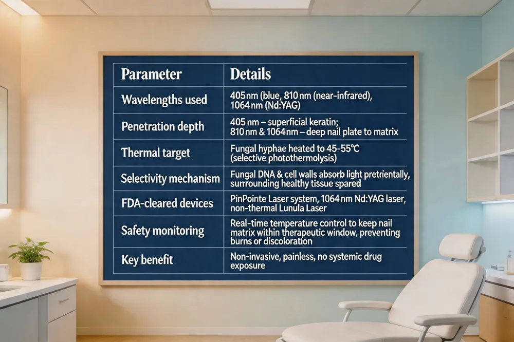 Wavelength matters: 405 nm targets superficial colonies, while 1064 nm Nd:YAG penetrates deeper nail matrix. Session number and spacing (2‑6 sessions, 4‑6 weeks apart) improve eradication. Nail thickness and degree of hyperkeratosis affect light transmission; pre‑treatment debridement or filing enhances efficacy. Combination with topical antifungals or photodynamic agents further raises clearance rates.