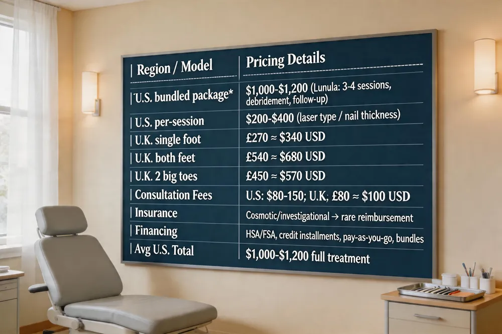 In the United Kingdom, a single Lunula laser session for one foot or hand is priced at £270 (≈ $340 USD). Treating both feet costs £540 (≈ $680 USD), while a session focused on the two biggest toes is £450 (≈ $570 USD). An initial consultation is billed at £80 (≈ $100 USD) and follow‑up visits at £35 (≈ $45 USD). These figures illustrate how costs can vary by region, currency exchange rates, and local clinic policies.