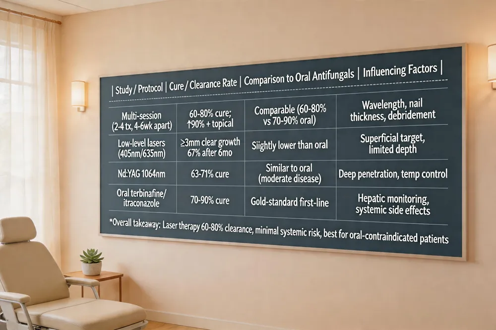 Multi‑session laser protocols (2–4 treatments spaced 4–6 weeks apart) report mycological and clinical cure rates of 60‑80 % for stubborn onychomycosis, with several trials noting up to 90 % improvement when combined with topical agents. Non‑thermal low‑level lasers (e.g., 405 nm/635 nm) have shown ≥3 mm clear nail growth in 67 % of nails after six months , while Nd:YAG 1064 nm devices achieve 63‑71 % cure in systematic reviews.