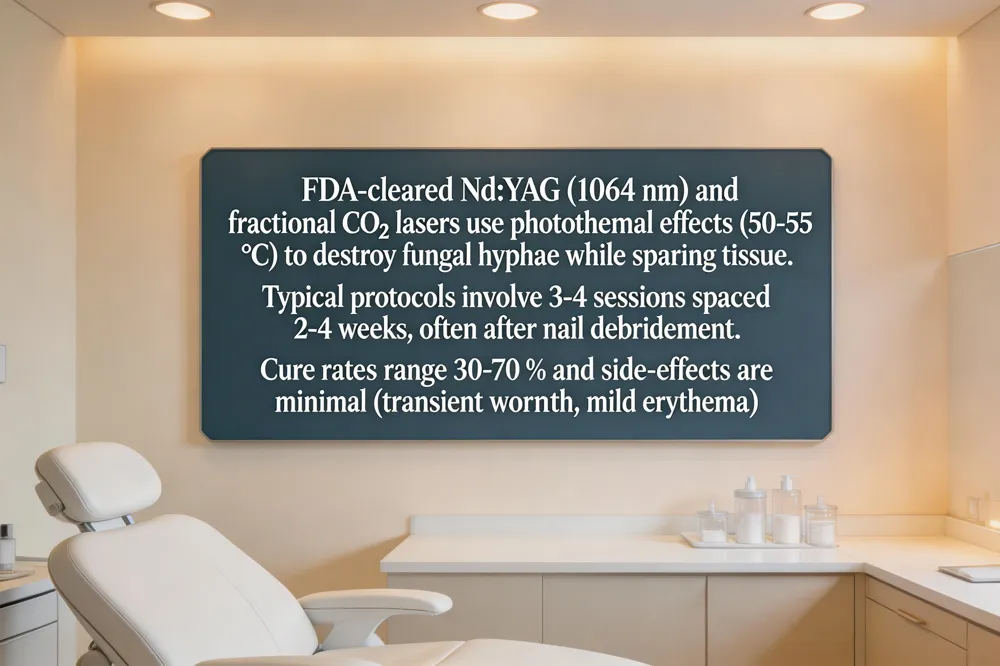 Laser therapy for onychomycosis relies on photothermal and photodynamic effects that heat fungal hyphae to 50‑55 °C, disrupting cell walls and DNA while sparing surrounding tissue. FDA‑cleared devices include Nd:YAG (1064 nm) lasers, which penetrate the nail plate and nail bed, and fractional CO₂ lasers, each delivering controlled energy in 15‑30‑minute sessions. A typical protocol consists of 3‑4 treatments spaced 2‑4 weeks apart, often preceded by nail debridement to improve penetration. Safety is excellent; patients report only transient warmth, mild erythema, or brief pain, with no systemic toxicity.