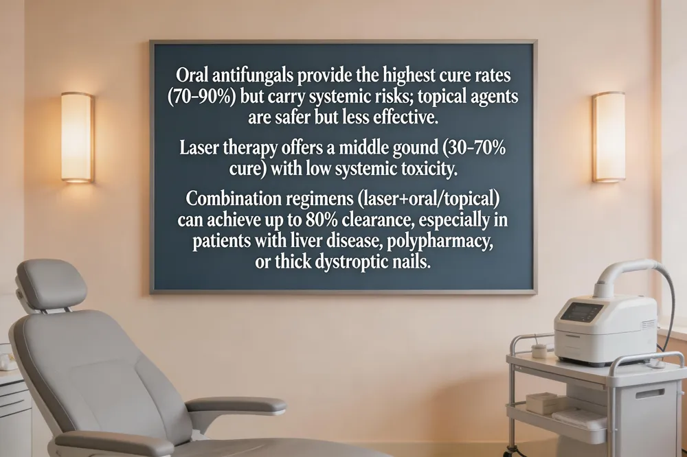 Combination approaches—laser plus oral or topical agents—show synergistic effects, with some studies documenting up to 70‑80 % clearance when laser reduces fungal load before medication is applied. Nail debridement or urea‑based thinning enhances drug penetration and laser efficacy.