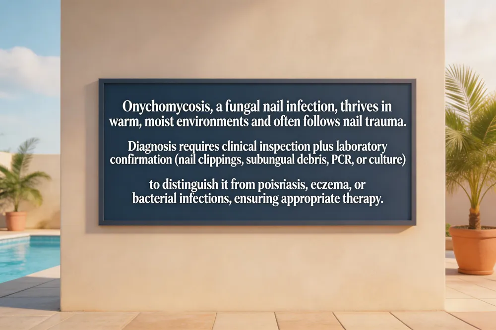 Onychomycosis is a fungal infection of the nail unit caused primarily by dermatophytes, but yeasts and molds can also be involved. Warm, moist environments—such as sweaty shoes, communal showers, or prolonged humidity—create ideal conditions for fungal spores to colonize the nail plate, while nail trauma or repeated micro‑injuries disrupt the protective barrier and allow organisms to penetrate to the nail bed. Accurate diagnosis begins with a thorough clinical examination, noting nail discoloration, thickening, onycholysis, and any associated skin changes. The Mayo Clinic and the American Academy of Dermatology recommend confirming the diagnosis with laboratory testing: nail clippings, subungual debris, or a PCR assay are sent for culture or direct microscopy to differentiate true fungal infection from mimicking conditions such as psoriasis, eczema, or bacterial paronychia. This step prevents unnecessary exposure to systemic antifungals and ensures that the chosen therapy—whether topical, oral, or laser‑based—is appropriately targeted. In practice, podiatric specialists often combine visual assessment with rapid point‑of‑care tests, reserving more extensive culture work‑up for atypical or refractory cases.