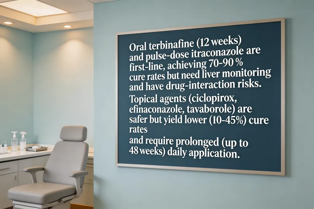 Side‑effects for oral antifungals include gastrointestinal upset, headache, rash, and the rare but serious Stevens‑Johnson syndrome or liver injury. Drug‑interaction concerns are significant, especially with itraconazole, which inhibits CYP3A4. Topicals are well tolerated, with occasional local irritation or mild erythema. In patients with liver disease, heart failure, polypharmacy, or peripheral vascular disease, podiatrist often prefers topical therapy or laser treatment to avoid systemic risks.