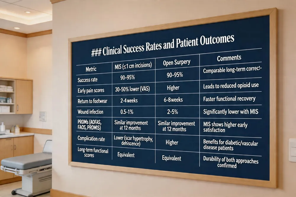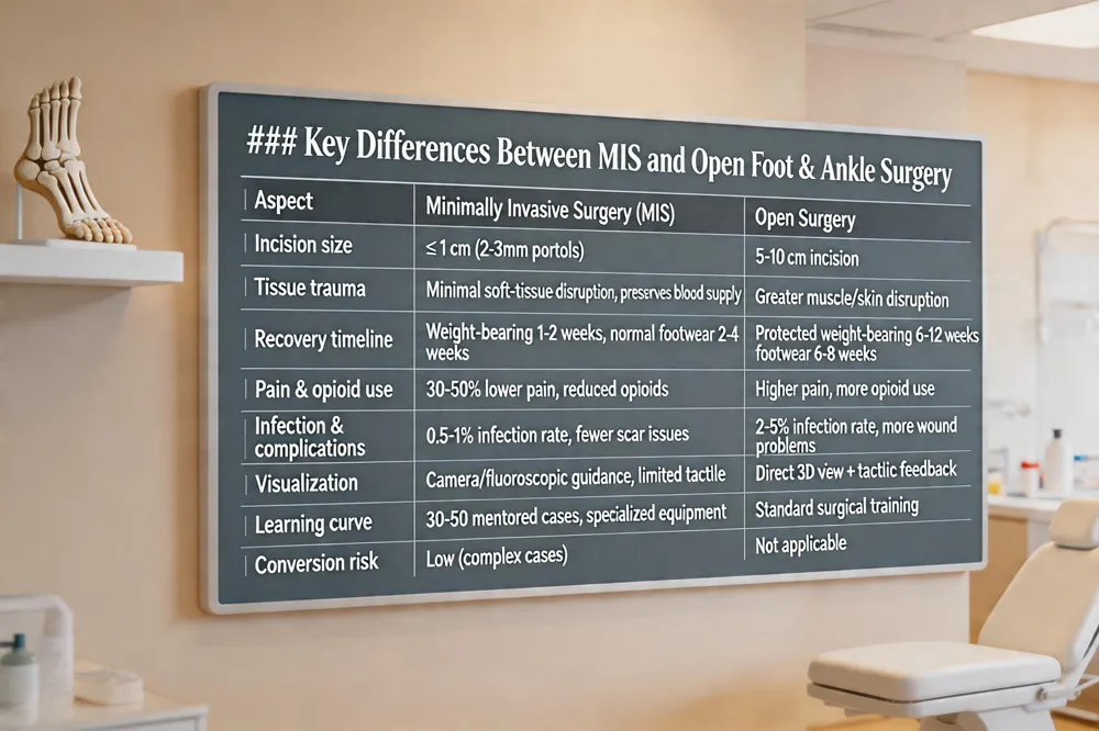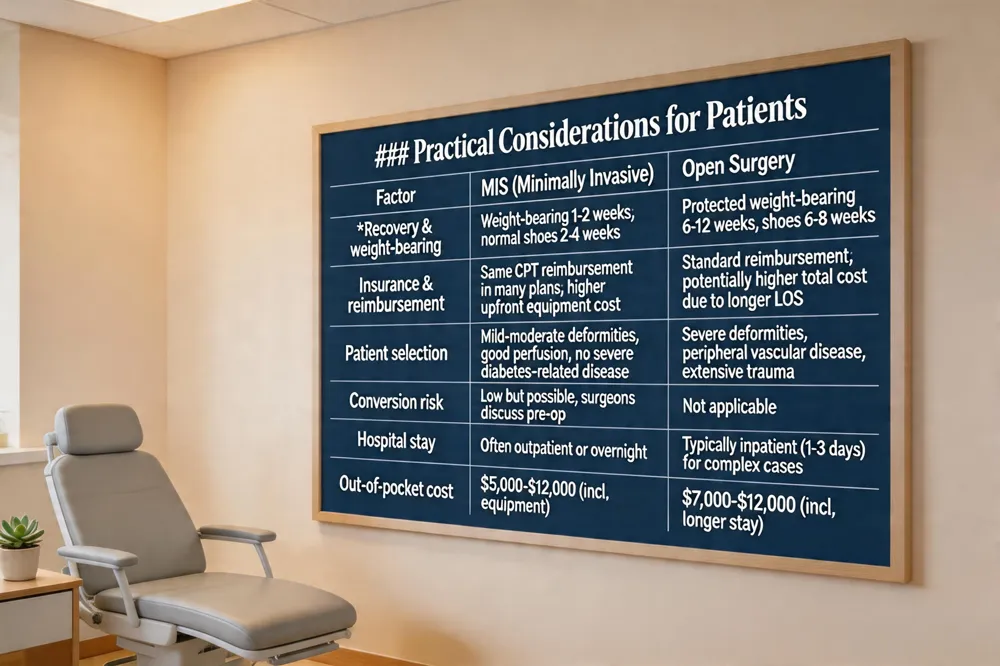 Recovery timelines and return to activity – Patients undergoing MIS usually bear weight or resume light activities within 2–4 weeks and return to normal footwear in the same window. Open surgery often mandates 6–12 weeks of protected weight‑bearing and a longer convalescence period.