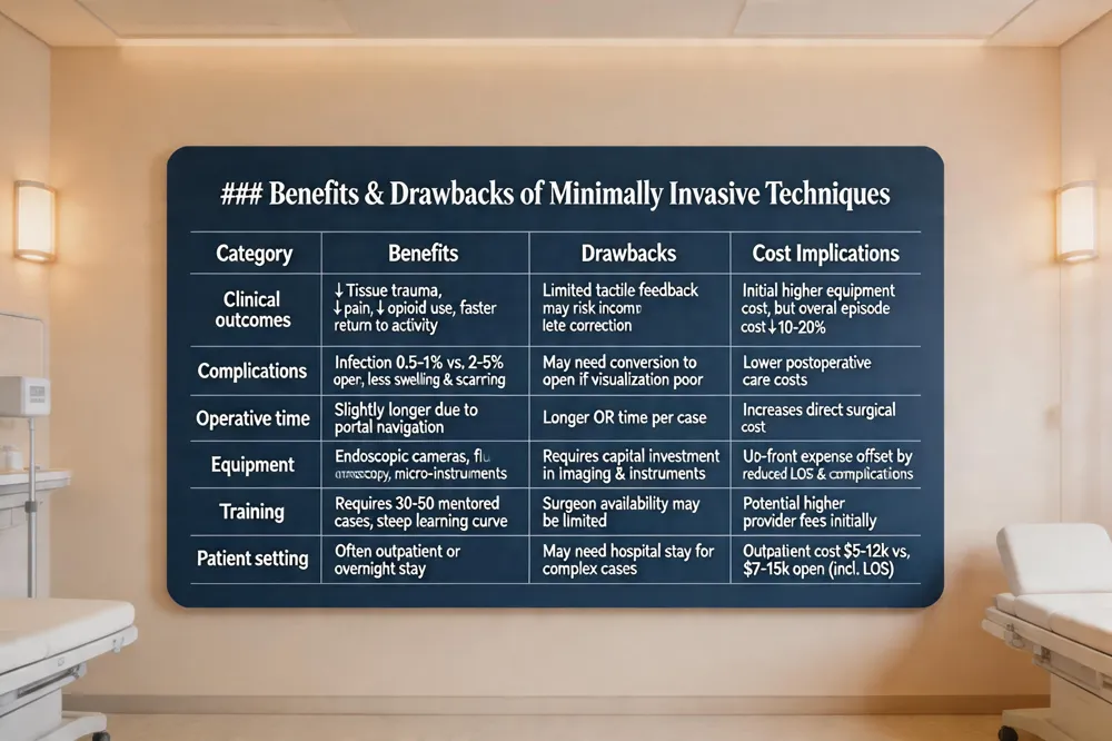| Insurance & reimbursement | Same CPT reimbursement in many plans; higher upfront equipment cost | Standard reimbursement; potentially higher total cost due to longer LOS |
