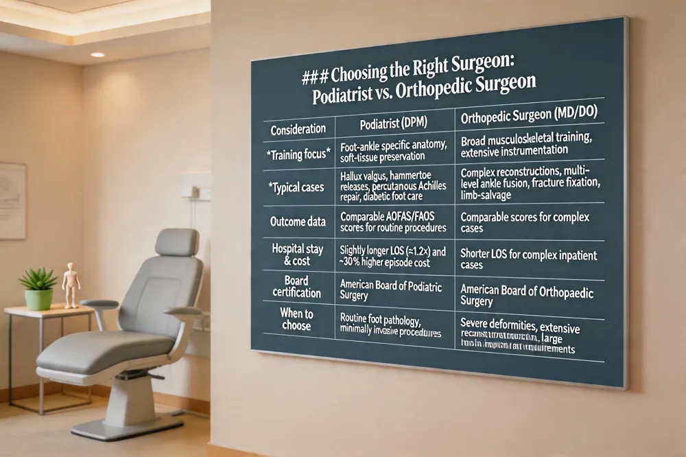 When an orthopedic surgeon is preferred – Complex deformities (severe flatfoot reconstruction, multi‑level ankle fusion), extensive fracture fixation, limb‑salvage procedures, or cases requiring large implants benefit from the broader musculoskeletal exposure and instrumentation expertise of an orthopedic foot and ankle surgeon.