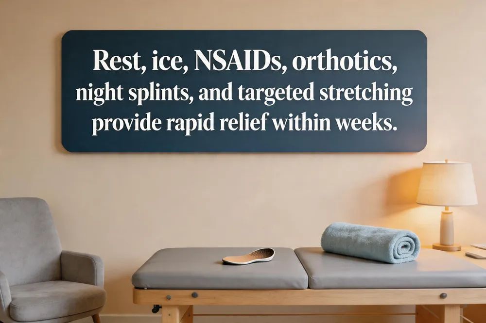 Quick‑relief strategies include aggressive ice, Night splints use, and daily 30‑second calf and fascia stretches; most patients notice meaningful improvement within 6–8 weeks. While a true cure in one week is unrealistic, intensive, protocol‑based care can dramatically reduce pain in that timeframe. For severe, immobilizing heel pain, immediate rest, elevation, and prompt referral to a foot‑and‑ankle specialist are essential to prevent chronic degeneration.