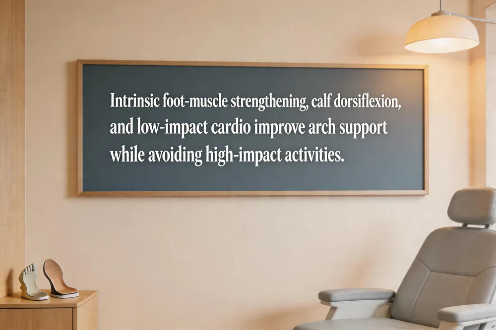 Progressive strengthening of intrinsic foot muscles helps support the arch and reduce strain. Toe‑curl towel scrunches (10‑15 repetitions, 1‑2 times daily), marble‑pickup drills, and balance‑board single‑leg stances improve toe‑flexor endurance and proprioception. Resistance‑band dorsiflexion and inversion exercises (10‑15 reps, 1‑2 times daily) target the anterior tibialis and invertors, promoting balanced foot mechanics. Gradual loading through short, pain‑free walks encourages collagen remodeling.