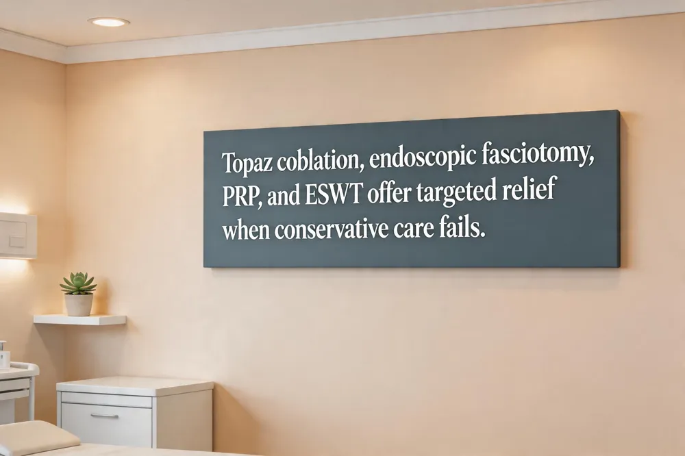 Topaz coblation – also called Topaz surgery or micro‑tenotomy, uses a radio‑frequency wand to create tiny perforations in the plantar fascia, breaking up adhesions and stimulating healing. Performed under local anesthesia in 10‑20 minutes, the technique requires only small punctures, resulting in minimal trauma. Patients wear a walking boot for about a week, then transition to supportive shoes with orthotics, and most resume normal activities within four to six weeks.