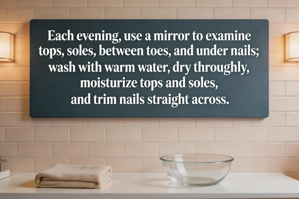 A thorough foot‑care routine starts each evening with a step‑by‑step inspection: use a mirror or enlist a caregiver to examine the tops, soles, between the toes, and under the nails for cuts, blisters, redness, swelling, calluses or drainage. Feel for warmth or pain, and note any changes in skin texture. Wash the feet in warm (not hot) water with mild soap, then pat them dry—paying special attention to the interdigital spaces to prevent maceration. Apply a thin, fast‑absorbing moisturizer only to the tops and bottoms of the feet; keep the toe web clean and completely dry because moisture there encourages fungal growth. Trim toenails straight across weekly, filing sharp edges, and avoid aggressive cuticle work. Perform the inspection and washing daily; use a soft brush, a pumice stone after soaking for callus smoothing, and a toe‑wiggling exercise to promote circulation. This daily hygiene and self‑inspection routine, combined with regular podiatrist visits, dramatically lowers the risk of ulcers, infection, and amputation in people with diabetes.