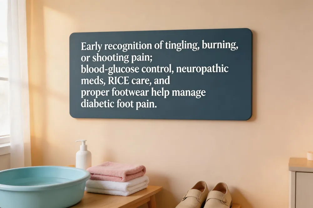 Diabetic foot pain often starts with tingling, burning or "pins‑and‑needles" sensations in the toes, progressing to sharp shooting pains that worsen at night and may be accompanied by numbness or allodynia. Early recognition of these symptoms is crucial because neuropathy can mask injuries. First‑line treatment combines strict blood‑glucose control with neuropathic pain medications such as gabapentin, duloxetine or topical agents like lidocaine patches to reduce localized discomfort. Home‑based care follows the RICE protocol: rest the foot, apply a cold pack for 10‑15 minutes, use a light compression bandage if tolerated, and elevate the leg to limit swelling. Circulation‑boosting techniques include warm (not hot) foot soaks with Epsom salt, gentle foot massages, calf stretches, and daily walking in well‑fitted, moisture‑wicking shoes with orthotic inserts to off‑load pressure points. Regular self‑inspection, proper nail trimming, and moisturization (avoiding the toes) help prevent infections and skin breakdown, while prompt podiatrist evaluation is essential when pain persists or ulcers develop.