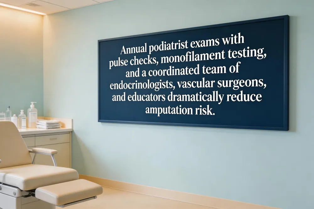 Routine podiatrist examinations should at least annually, include visual inspection, pulse palpation, monofilament testing and risk stratification to identify low, moderate, high or very‑high risk feet. Early detection of neuropathy or peripheral arterial disease allows timely off‑loading, custom orthotics and wound care. A multidisciplinary team—endocrinologist, primary‑care physician, podiatrist, vascular surgeon and diabetes educator—has been shown to cut major amputation rates by over 30% in studies such as the Italian cohort. Team members coordinate glycemic control, blood‑pressure management, smoking cessation and exercise programs while the podiatrist focuses on foot‑specific issues. Patient‑education resources, including the "Diabetic Foot Care Nursing Procedure" PDF, provide step‑by‑step protocols for foot inspection, cleansing, nail trimming, callus debridement and moisturising, with clear referral criteria for specialist care. Regular foot‑care articles reinforce the importance of daily self‑inspection, moisture‑wicking socks, proper footwear and overall diabetes self‑management as the foundation of limb preservation.