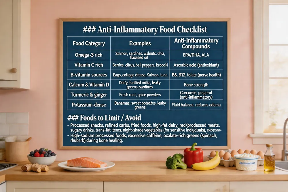 - High‑sodium processed foods, excessive caffeine, oxalate‑rich greens (spinach, rhubarb) during bone healing.