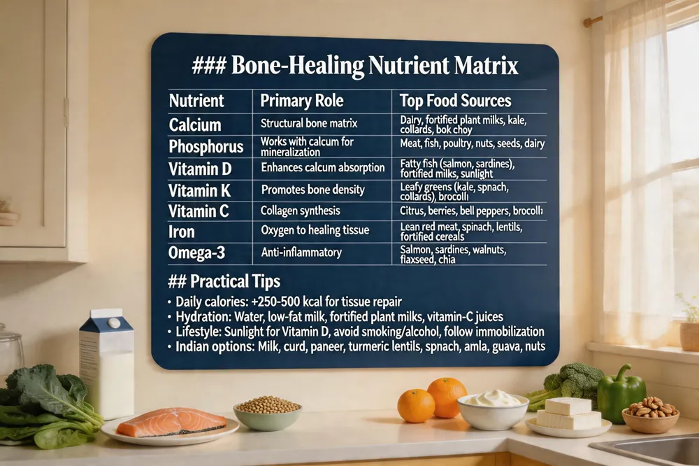 - What to eat for faster bone healing? Prioritize dairy or fortified plant milks, leafy greens, fatty fish, citrus fruits, beans, and nuts to supply calcium, phosphorus, vitamin D, K, C, iron, and omega‑3s.